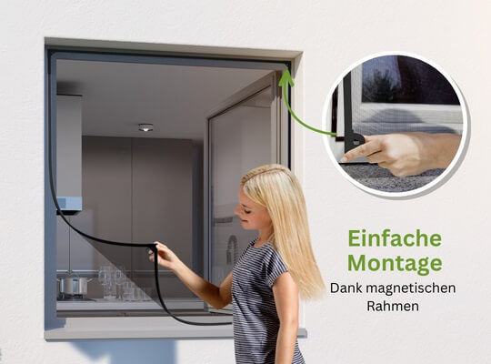 Ähnlich wie beim Klettband, wird am Fensterrahmen (außen) das Magnetband angebracht, an dem anschließend der Kunststoffrahmen aufliegt. Schnelle Montage und ideal für Mietwohnungen.