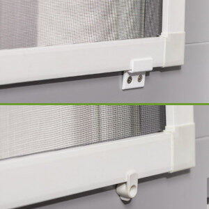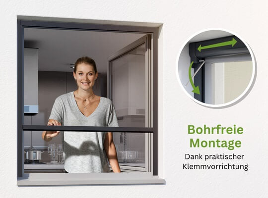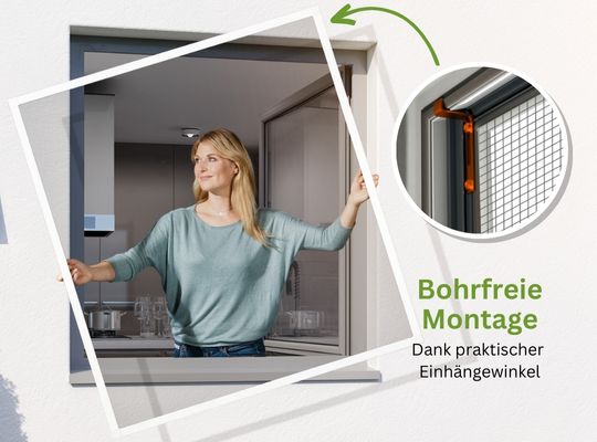 Nahezu alle unsere Produkte können bohr frei via Einhängefedern in den Fensterrahmen  eingehängt werden. Der Fliegengitter Rahmen liegt dabei am bündig Fensterrahmen auf.